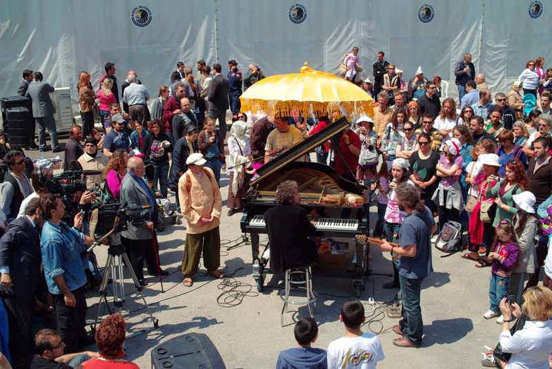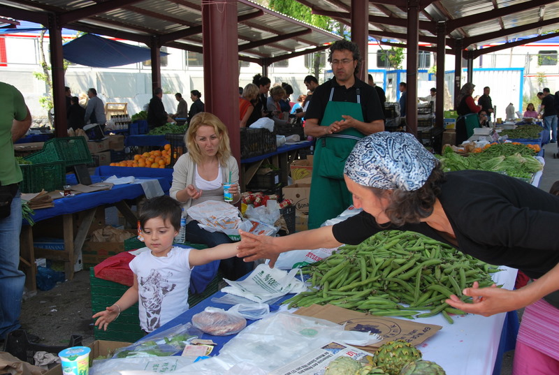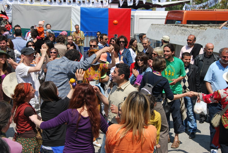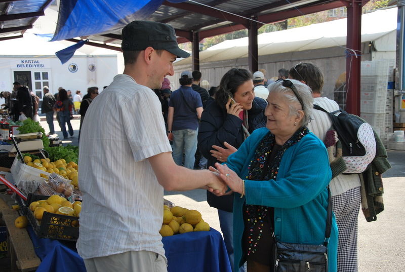 Nous quittons la magique ville d'Istanbul pour nous rendre à Kartal où nous sommes attendus à 12h sur un marché bio. Nous sommes accueillis par les responsables de l'association Bugday (qui signifie blé) : Victor Ananias et Gizem Altin Nance qui ont organisé cette rencontre. Beaucoup de journalistes sont présents pour couvrir l'événement. Les articles de journaux dans la presse turque ont permis à la Caravane amoureuse de véhiculer son souffle et la Turquie répond à l'appel plus que nous n'aurions pu l'imaginer. C'est ensuite un temps musical de partage qui nous est offert avec Marc au piano, Sehnaz Sam chanteuse turque célèbre dans le pays et son mari, guitariste. Ils improvisent ensemble et la magie de l'instant opère, Charlou se joint à Sehnaz et leurs voix nous emportent. Et puis on ne sait comment, les corps se mettent à danser, à tourner, les rondes se forment, petits et grands sont à la fête. De nombreuses personnes nous demandent ce que nous faisons ici et l'explication de la Caravane amoureuse les touche. Après un tour dans le marché, la fête touche à sa fin vers 14h et nous apprenons que nous sommes tous invités dans un restaurant de la ville. Une fois sur place, nous sommes ébahis de la beauté du lieu. Nous montons tous en haut du restaurant et là, de grandes tablées sur la terrasse face à la mer, nous attendent. Quelle générosité et quel sens de l'accueil ! Nous nous régalons de ce repas de poissons pantagruélique offert par le maire Altinok Oz et le club de foot Galatasaray, représenté par son président Adnan Polat et sa femme. Musique, chants et rires sont au rendez-vous. Victor m'explique les différentes missions de l'association Bugday. Cela a commencé il y a une vingtaine d'années par l'exploitation de terrains et de fermes biologiques, notamment pour se rendre sur les marchés. L'association a aussi une action sociale en sensibilisant les jeunes dans les écoles à l'alimentation saine et biologique, l'habitat écologique, et le respect de l'environnement plus globalement. Elle tient également un restaurant ouvert à tous. L'association œuvre aussi à la construction de maisons écologiques. Enfin, les acteurs de l'association travaillent également à un niveau politique en sensibilisant les élus à leur démarche et en les associant à leurs projets. Mais comme le précise Victor, cela se fait toujours par le biais de rencontres créant une relation privilégiée avec les personnes concernées. La philosophie de l'association Bugday est la même que celle de la Caravane amoureuse dans le sens où toutes leurs actions ont pour but d'apporter davantage de conscience et d'harmonie entre les Hommes et leur planète. Le repas se termine en fin d'après midi et nous rentrons doucement au bivouac, place du marché, en longeant la mer à pied. Point de repas ce soir, nous sommes repus ! Encore une journée pleine de surprises, l'amour est là, sans aucun doute.