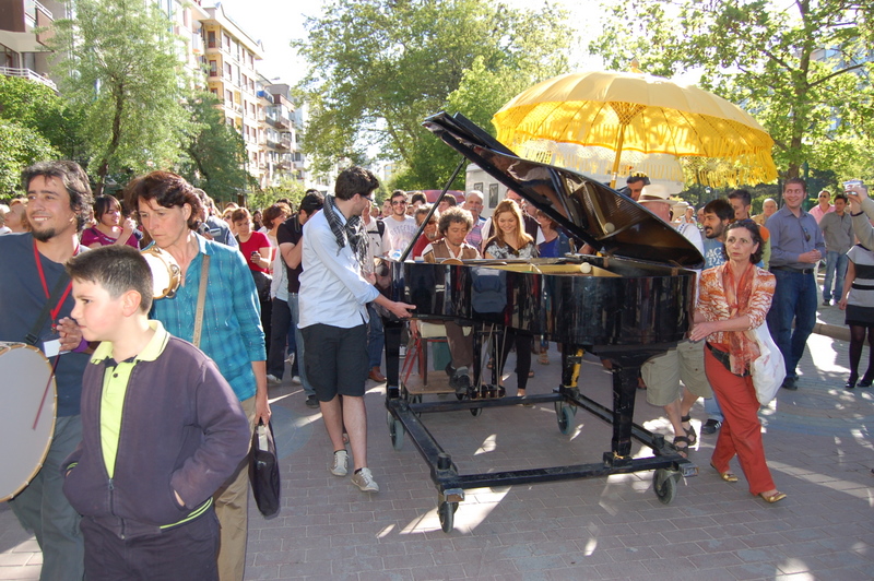 At some point, the piano and the whole parad stop at bottom of a balcony where a saxophonist thrills the crowd. He finally joins everybody in the street. Magic of love and music operates as different generations, people from different nations, religions share embraces, dance, laugh and cry. Everybody seems deeply moved by this afternoon. Some of us are even frustrated to leave our friends of Eskisehir. But the caravan must go on.