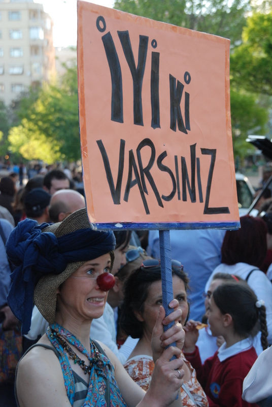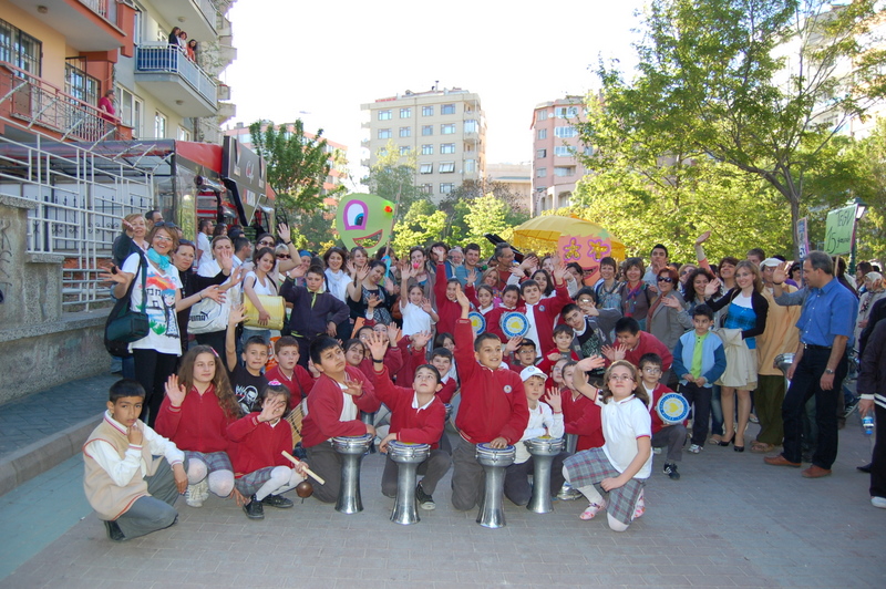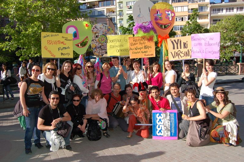 Nous quittons Istanbul pour Eskişehir, ville d’environ 700 000 habitants située à 250 km au sud est. Mme Didem Aydinmakina, directrice du centre éducatif Atatürk Egitim Park, de la municipalité, nous accueillent et nous font visiter fièrement les locaux de l’école. Elle fait partie comme 86 autres écoles en Turquie du réseau Eğitim Gönüllüleri, d’éducateurs volontaires. Ce réseau est financé en grande partie par des entreprises privées, ce qui permet à l’école de bénéficier de très bons équipements. La pédagogie est axée sur l’apprentissage par l’expérience et les arts ont une place importante dans l’enseignement. Nos hôtes nous mènent ensuite au centre ville, en quête d’une place pour le piano. En bordure de rivière, les cafés se succèdent et ce sera finalement une itinérance musicale avec le piano qui restera sur ses roulettes. Ouverture de ce moment festif avec les percussions des enfants de l’école. Des banderoles accompagnent le cortège « Bienvenue à la Caravane Amoureuse ». Qu’il est bon de descendre dans les rues sans autre revendication que celle de l’amour ! Le piano prend la suite et c’est une déambulation qui entraîne sur son passage jongleurs, musiciens, danseuses, clowns, et tant de sourires. Les passants s’arrêtent, curieux, puis attentifs et progressivement les visages sourient et osent l’échange. Echanges de regards, de mains qui se serrent entre caravaniers et passants, de bisous, de danses pour saluer, remercier, encourager, manifester la joie d’être simplement présent. Echanges aussi entre générations, une femme d’environ 75 ans vient me serrer les mains, son regard de gratitude me touche et m’encourage à emmener les femmes qui m’entourent dans la danse. Les habitants sortent sur leurs balcons et partagent cette joie. Sur l’un des balcons, un homme prend son saxophone et improvise en écho au piano de Marc. La magie opère, il descend et poursuit la route avec nous. Lui et quelques autres rencontres resteront avec nous jusqu’au soir, pour poursuivre le partage.
