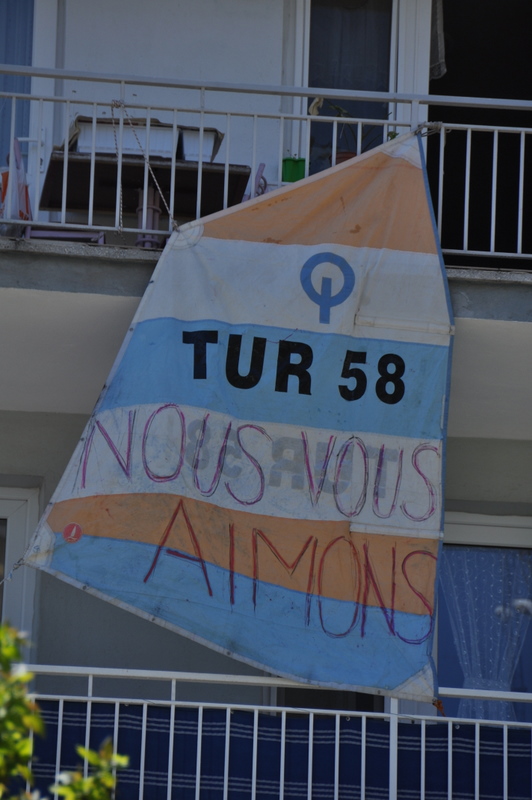 Sachant que nous repassions en bateau le lendemain sur le canal, notre saxophoniste de passage a accroché pour nous un message à son balcon.