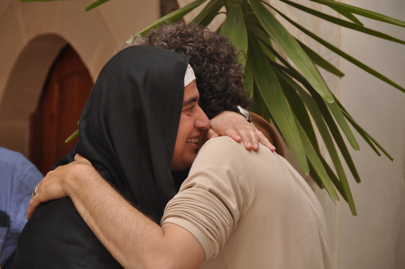 Et j’ai la grande joie de découvrir que celui qui a amené ce groupe en ce lieu n’est autre que Sébastien de Fooz, pèlerin belge, auteur du livre « A pied à Jérusalem, 184 jours, 184 visages » (édité chez Racine). Il y retrace son périple tant extérieur qu’intérieur, à travers les péripéties du chemin et les multiples visages approchés. L’occasion nous est donnée de l’entendre nous conter quelques épisodes qui lui ont valu de vivre des moments de joie profonde, de découragement, d’épuisement même, d’éblouissement aussi et des rencontres fabuleuses telles que ce monastère et son énergie d’unité. C’est ici tout particulièrement, loin de la ville sainte de Jérusalem, qu’il a trouvé la paix et l’amour. Il y revient souvent tel une boussole « aimantée » et il conduit des personnes en quête de la source. Il se propose d’organiser une marche pour la paix en 2012, entre Bruxelles et Jérusalem. La Caravane amoureuse et la marche ont un langage commun : l’amour, et ce lieu sacré nous a permis d’en prendre conscience. Mère Agnès-Maryam en a été l’artisan rassembleur.
