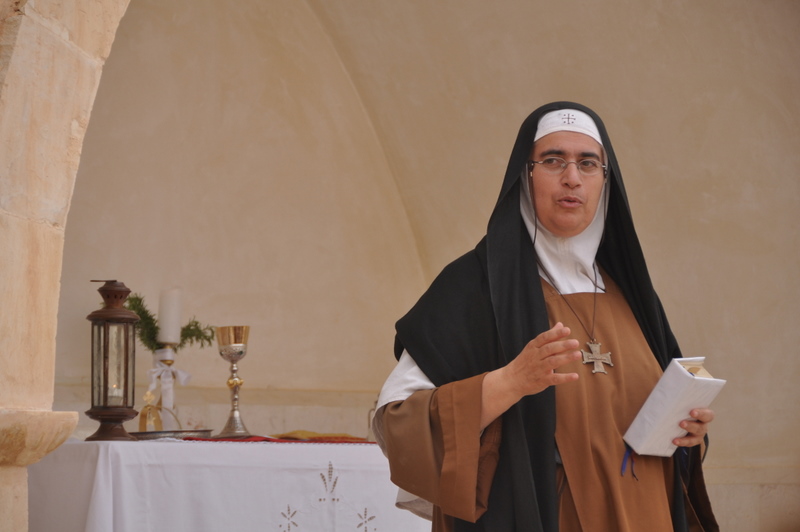 Elle nous explique que ce lieu fut aussi un temple païen dédié à la lune comme l’atteste son orientation. Ici vivent 5 sœurs, le couvent faisant partie de l’Unité d’Antioche. Sœur Claire-Marie explique que Mère Agnès-Maryam, la mère supérieure et elle même sont carmélites.