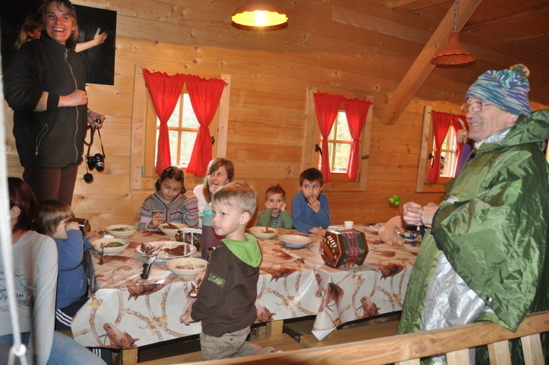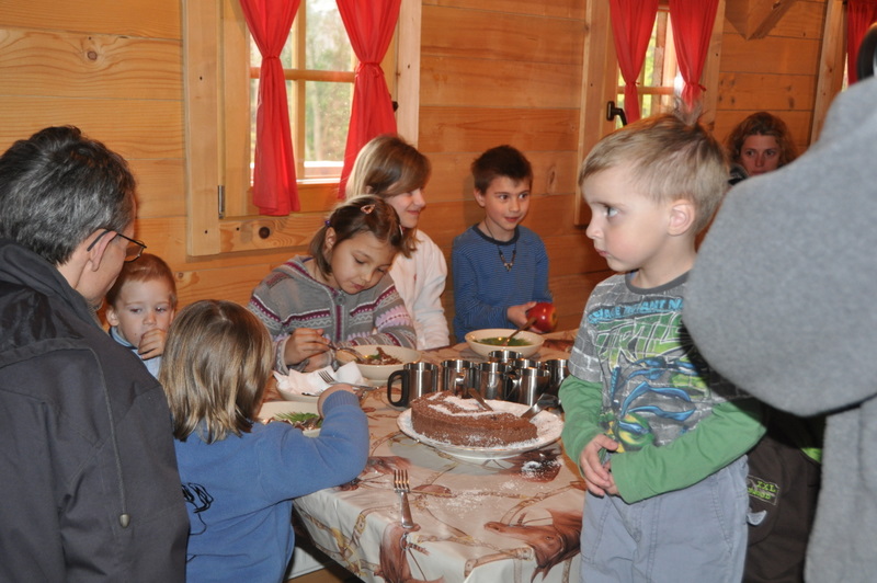 Tea-time in their wooden handmade house : sharing a child birthday party.