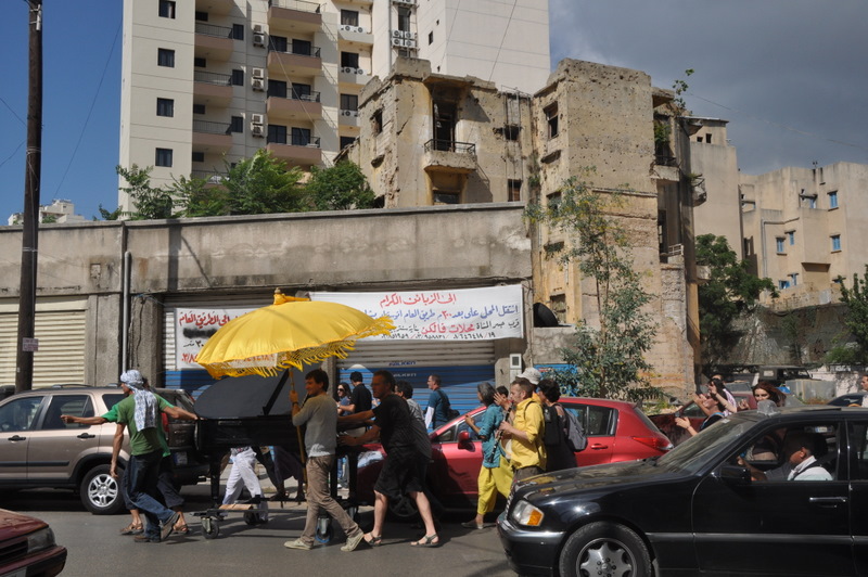 Partis du musée, nous déambulons dans une des rues principales de Beyrouth. Je suis à la proue du piano pendant que Marc joue. Nous passons devant un soldat dans un tank. Son visage est fermé. Il ne répond pas à mon salut. A notre second passage, je lui souffle un bisou. Il répond, enfin. Un petit signe de la main, et un petit sourire. Il se trouve dans une contradiction : assurer sa fonction, avec tout le sérieux qu’elle requiert, pour imposer à la fois la peur à l’autre et la peur de l’autre. Et l’envie de se laisser aller à la légèreté d’un sourire. De s’abandonner.