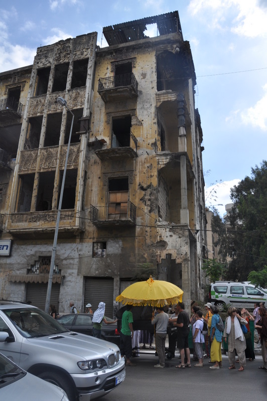 Beyrouth, grande mégalopole, étend ses routes et ses immeubles sur plusieurs kilomètres le long de la côte. Passer coûte que coûte est la seule règle de conduite qui prévale ici. Nos bus se faufilent, et ne se lâchent pas d’un fil pour ne pas se perdre au milieu de cette circulation folle. Même sur les 2 fois 3 voies, des hommes se mettent entre les files pour vendre chapeaux ou autres objets à 3 sous. C’est ainsi que nous faisons nos premiers pas dans la capitale libanaise.
