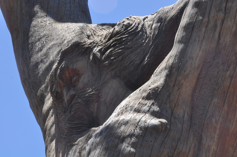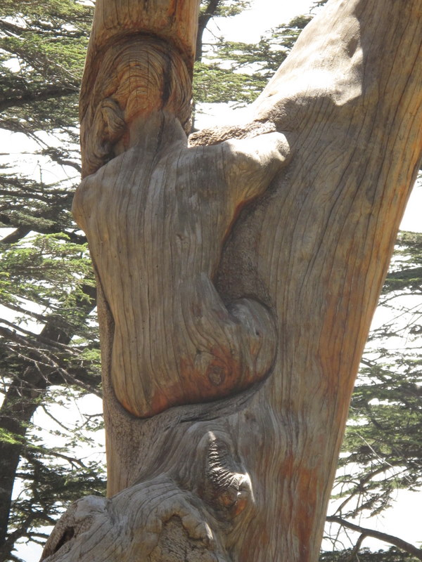Nous marchons dans la forêt. Une coccinelle vient se poser sur mon épaule et m’accompagne pendant une bonne partie du chemin. Nous nous arrêtons dans une clairière, où nous découvrons les souches de cèdres sculptées par Rudy Rahmé. Des visages à l’expression tantôt espiègle, tantôt douloureuse,