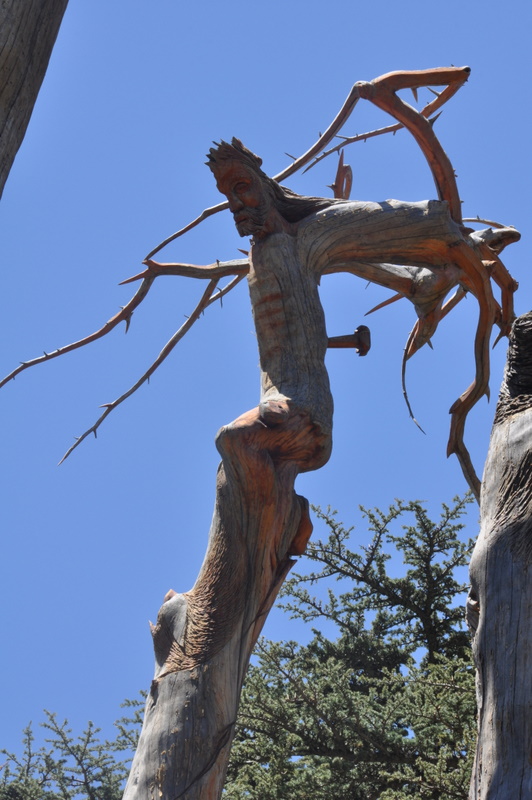 un Christ juché en haut du vieux tronc, qui semble davantage défier la montagne en face que le ciel… !