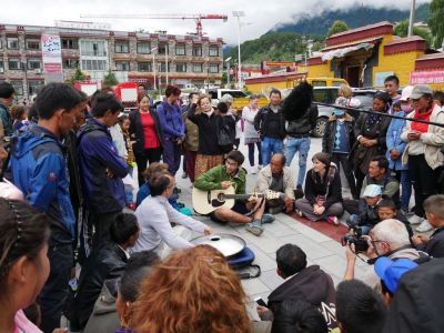 En quittant ce lieu, nous remarquons un attroupement d’enfants et d’adolescents. La guide nous explique alors qu’il s’agit de tibétains des campagnes alentours qui viennent passer la semaine au pensionnat pour étudier en ville. Samuel invite un des enfants à venir jouer du hang puis le groupe se met en cercle avec eux pour danses et chants bretons entraînés par Claudia.