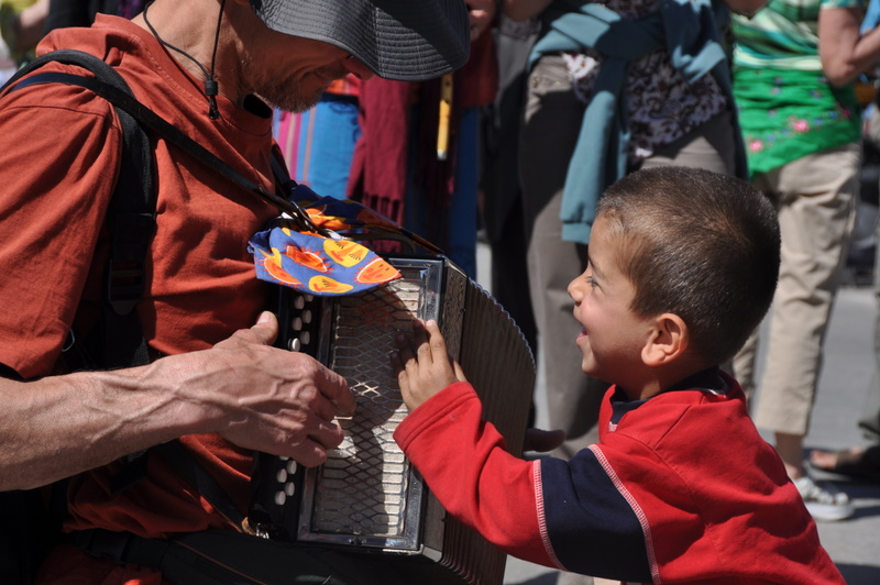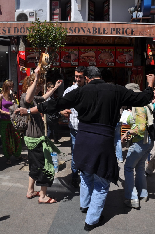 Forts de ces précieux instants, nous partons déambuler dans les rues d’Istanbul accompagnés de nos instruments de musique et de notre joie. L’accueil qui nous est réservé est plein de liesse. Dans la rue, hommes, femmes et enfants nous ouvrent leurs bras et leurs coeurs au son des « Sizi seviyorum » (qui signifie « je vous aime » en langue turque). Les sourires fusent de part et d’autres. Pas l’ombre d’une émeute durant cette belle journée ensoleillée dans le centre ville d’Istanbul : nous n’avons rencontré que de la Joie.