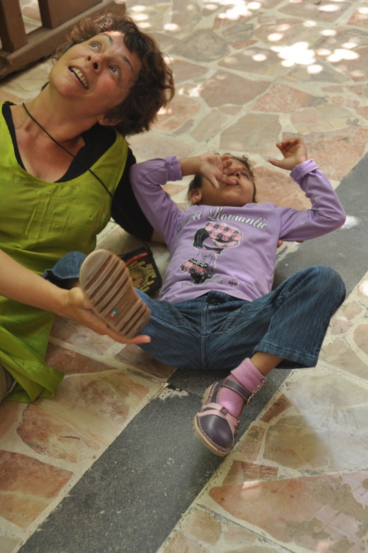 Je le regarde, sa tête tourne lentement d’un côté puis de l’autre, ses mains cherchent à attraper un biscuit que lui a donné le Père Paul Slimane. Ce biscuit est dans un emballage bleu qui brille, nous demandons si nous pouvons l’aider à le manger ? Surtout pas ! Cet enfant ne peut pas manger, il n’a pas la capacité de déglutir. Ses muscles sont trop faibles pour qu’il se tienne debout... De longues explications s’ensuivent, les personnes qui s’occupent de ces enfants handicapés sont admirables dans leur humanité. Jean-Marie Schmidt s’y consacre depuis 29 ans, il a imaginé un système pour que ces enfants là ne restent pas couchés toute leur vie, il a utilisé le principe du « diable » pour qu’ils puissent retrouver la verticalité de l’homme.