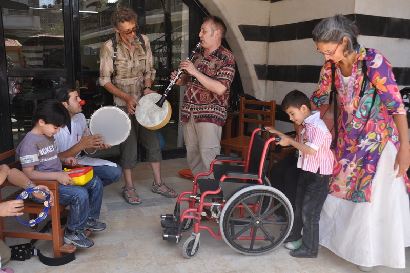 A Damas, dans un centre pour enfants handicapés « Terre des hommes », j’ai fait une rencontre inoubliable. Tesni, une petite fille de 7 ans environ, était dans les bras de sa maman. Nous sommes entré en relation l’une et l’autre par l’intermédiaire de mon tambourin. Plus qu’en relation, nous nous sommes rencontrées elle et moi. Je pouvais lire dans ses yeux la joie qu’elle avait de s’échapper par le biais de la musique et aussi sa force de vivre. Je constate une fois de plus que le handicap n’est pas un barrage ou une limite à partir du moment où je considère la personne dans son humanité, ce qui était le cas avec Tesni.