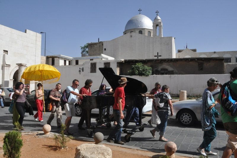 Pour le concert du soir, nous décidons d’emmener le piano en déambulation dans les rues de Damas. Le temps de le descendre du fourgon, il perturbe quelque peu la circulation ! Notre stratégie face aux automobilistes ? Une avalanche de joie de vivre et d’Amour qui trouve écho malgré les embouteillages générés. Un policier mécontent nous demande de nous ranger sur le trottoir, mais il est trop étroit pour un piano à queue ! Après quelques explications, il décide de nous accompagner, sous les ovations des automobilistes et des Caravaniers conquis ! Escort avec gyrophares et une belle ouverture d’esprit et de cœur. Nous poursuivons au milieu de ruelles aussi étroites qu’alambiquées. Certains passants sont incrédules, d’autres nous suivent... Rencontre inattendue : l’homme du thé de ce matin !