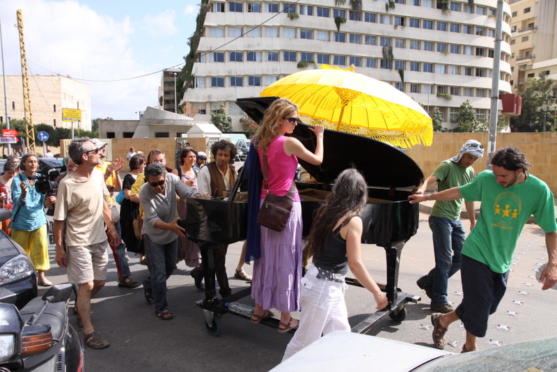 Partis du musée, nous déambulons dans une des rues principales de Beyrouth. Je suis à la proue du piano pendant que Marc joue. Nous passons devant un soldat dans un tank. Son visage est fermé. Il ne répond pas à mon salut. A notre second passage, je lui souffle un bisou. Il répond, enfin. Un petit signe de la main, et un petit sourire. Il se trouve dans une contradiction : assurer sa fonction, avec tout le sérieux qu’elle requiert, pour imposer à la fois la peur à l’autre et la peur de l’autre. Et l’envie de se laisser aller à la légèreté d’un sourire. De s’abandonner.