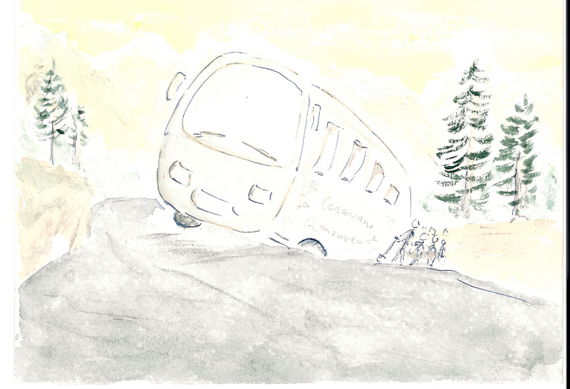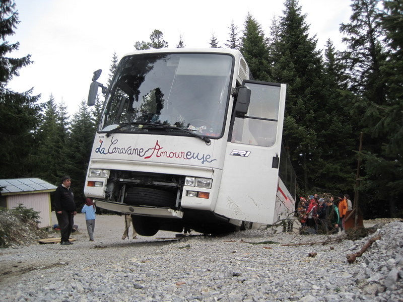 Dix heures, la Caravane quitte le site. Les bus Kagi, Gédéon sortent sans difficultés du parking. Caribou s'engage à son tour dans le chemin de pierrailles en pente et s'enlise. Le chauffeur Pablo insiste, rien à faire. Complètement bloqué, le bus se retrouve avec la roue avant droite en l'air, les deux roues arrières tordues et le pneu arrière gauche enfoncé jusqu'à la gente. Tout le monde sort du bus consterné. On sort les pioches, les pelles, rien ne bouge. Kagi revient en marche arrière, la solution serait de le tirer avec un câble. Mais la route de graviers ne permet pas la manœuvre. Les 20 tonnes de Caribou sont plantées. Chacun a une idée sur la question, mais aucune solution réellement concrète. On apprend qu'un tractopelle va arriver d'ici deux heures. Soulagement général. Une heure plus tard, alors que je suis en train de lire, je vois Caribou passer devant moi. Je lâche mon bouquin et cours voir le chauffeur Pablo.