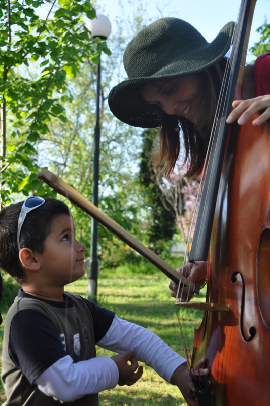 pendant que Cathy, un peu plus loin, fait découvrir la résonnance du violoncelle