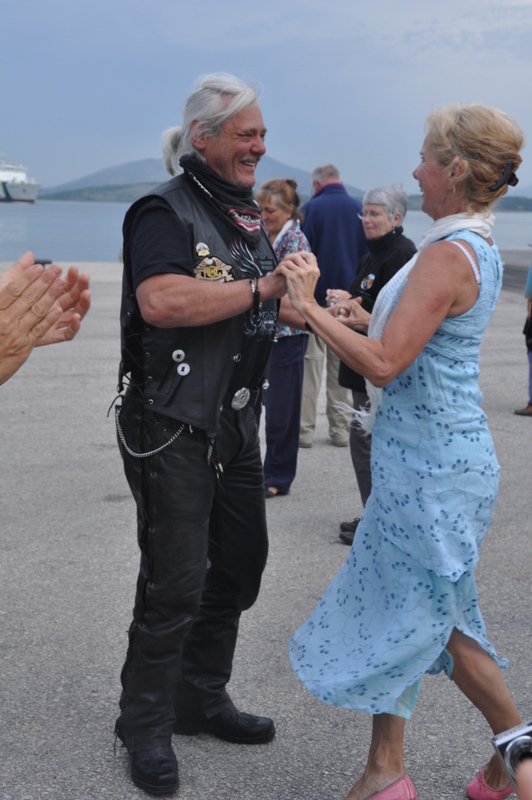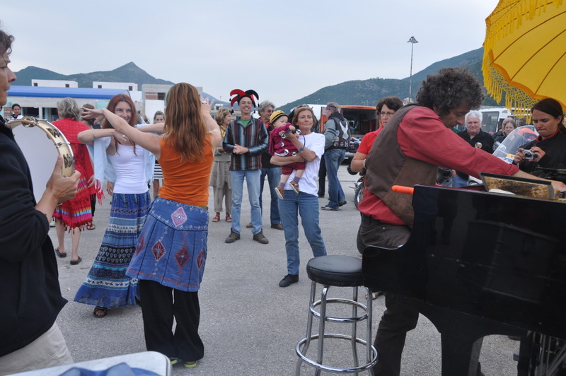 Le temps d’attente à l’embarquement est suffisant pour sortir le piano sur le parking. Nous partageons un moment de musique et de danses avec de nombreux motards intrigués par notre groupe. Sympathiques rencontres que nous prolongeons tout le temps de la traversée entre Igoumenitsa et Venise. Soirée sur le pont au rythme des Derboukas, tambourins et accordéon...