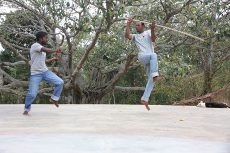 Puis suit une démonstration percutante d’un art du bâton avant que Dola, Wasoude, Rao, Ajayand et Vaibhou nous jouent des tablas et de l’harmonium. Catherine au violon, Joaquim au tuba, nos Caravaniers musiciens offrent avec générosité leurs talents. Un jeune du Centre Ajay joue de la tabla.