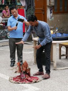 Des caravaniers vont à la rencontre du public masculin (une seule femme cadre présente). Ce contact est l’une des signatures de la caravane amoureuse, c’est à dire rencontrer l’autre avec respect, dans un regard bienveillant, avec délicatesse, douceur et joie. Le namasté (mains jointes devant la poitrine signifiant « J’honore la divinité qui est en toi ») est parfois suffisant pour un heureux message d’occidentaux. Nous déposons un bisou sur la joue et prenons les personnes dans nos bras (Hug) si elles ressentent ce même élan de fraternité.
